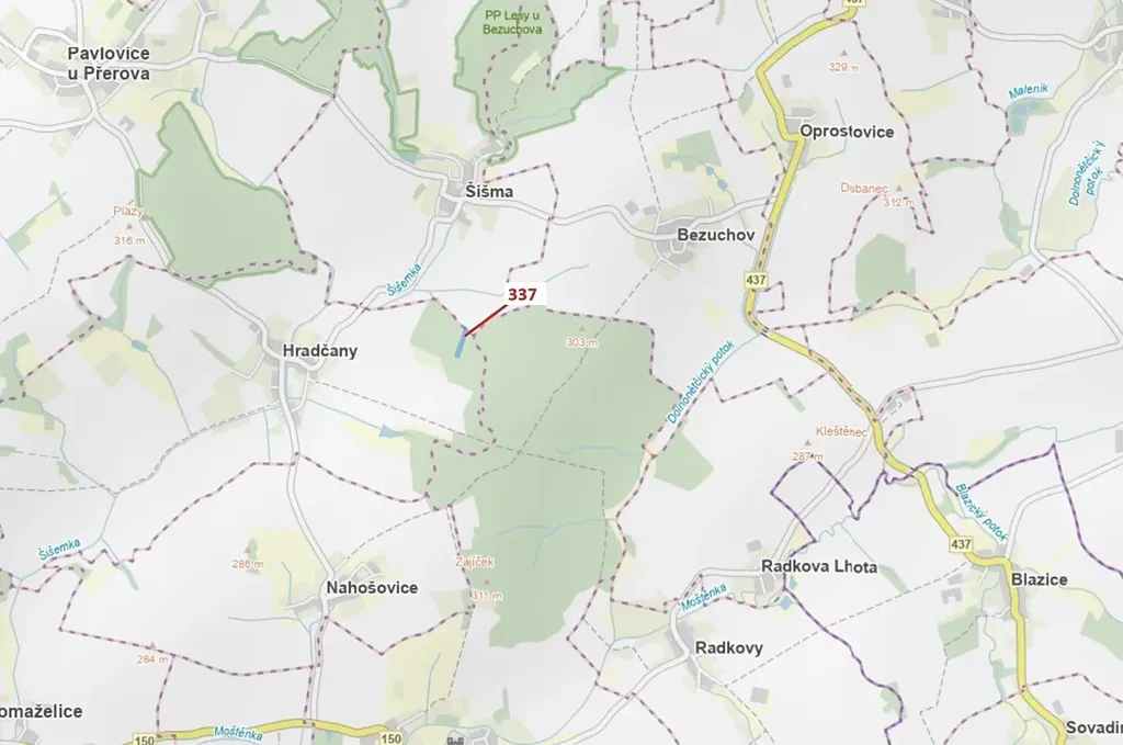 Lesní pozemek o výměře 5 963 m2, parcelní číslo 337, podíl 1/1, katastrální území Hradčany na Moravě, obec Hradčany, obec s rozšířenou působností Přerov, okres Přerov, Olomoucký kraj. Po těžbě.