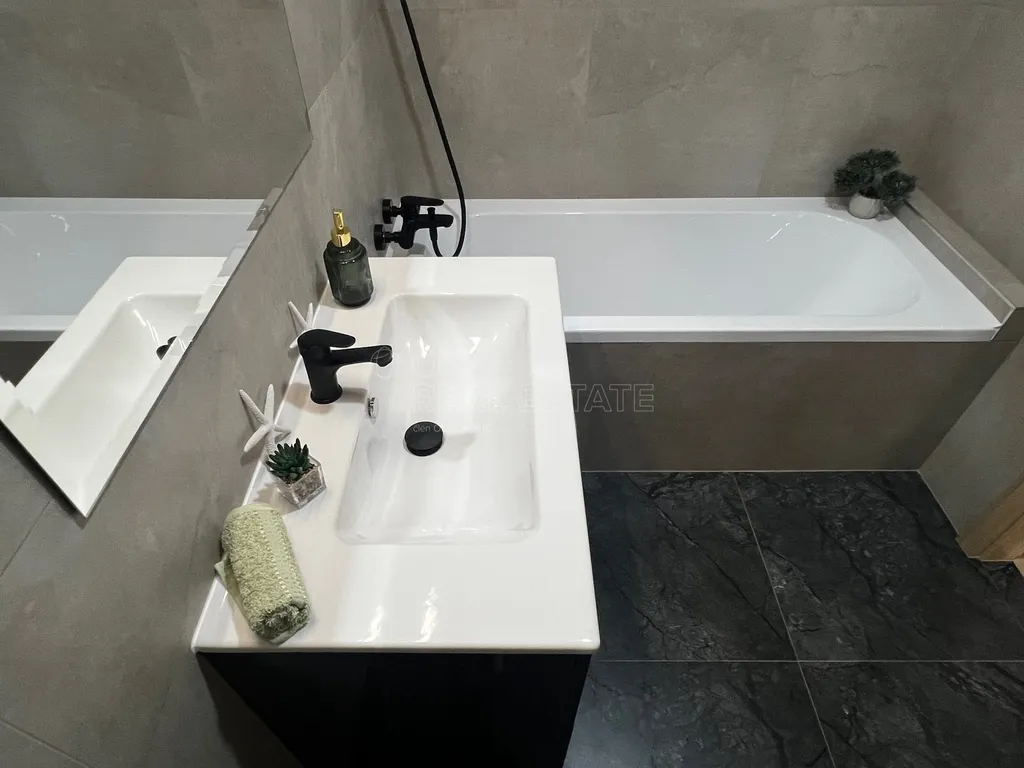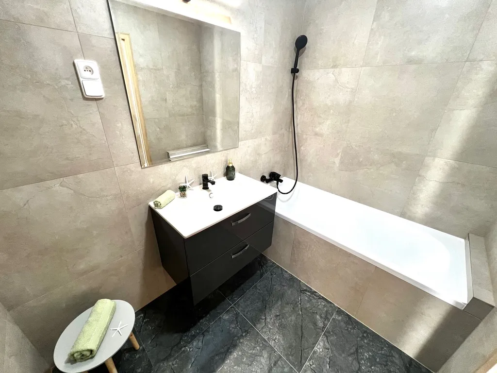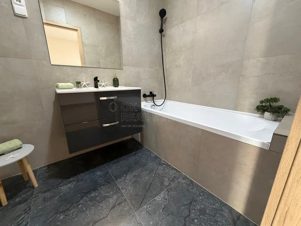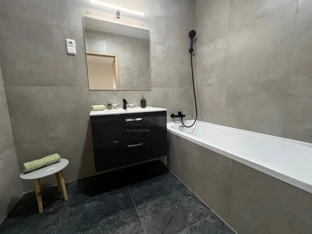 - Moderní koupelna: zděné jádro s vanou, přípojka na pračku a sušičku a samostatnou toaletou.