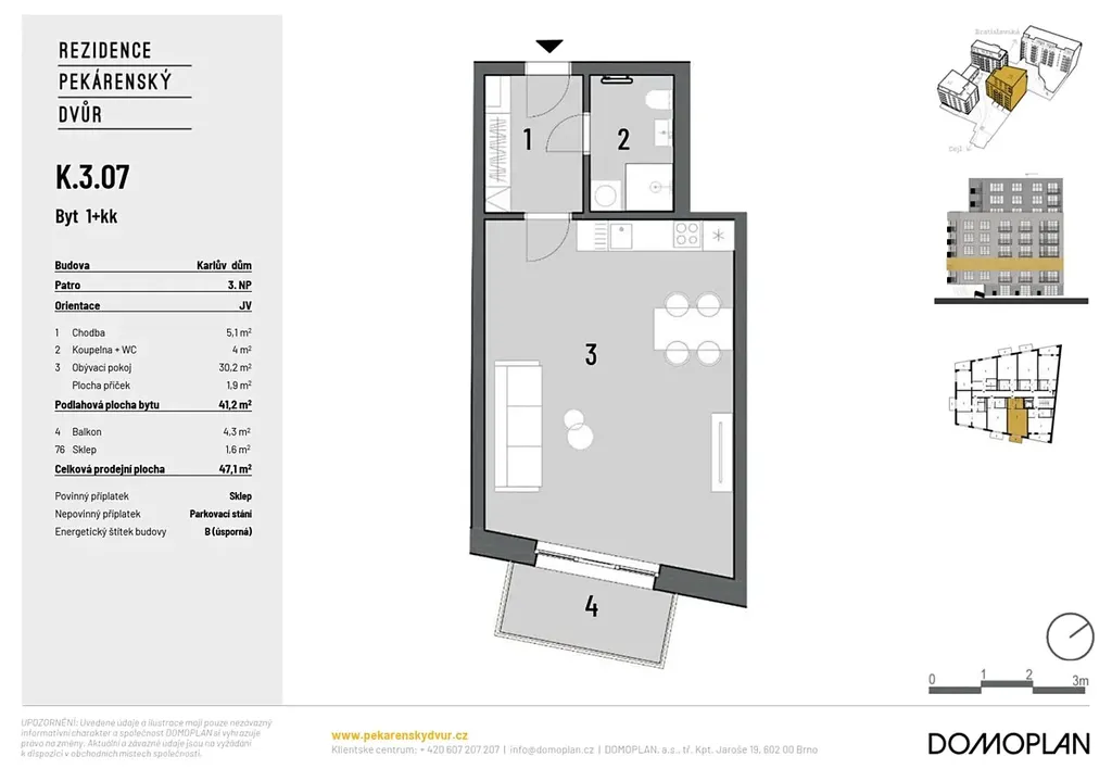 Nabízíme k prodeji moderně navržené jednotky 1+kk o celkové ploše 41,2 m2 s balkonem o velikosti 4,3 m2. Dispozičně jsou jednotky řešeny obývacím pokojem s kuchyňským koutem, koupelnou se sociálním zařízením a předsíní.
