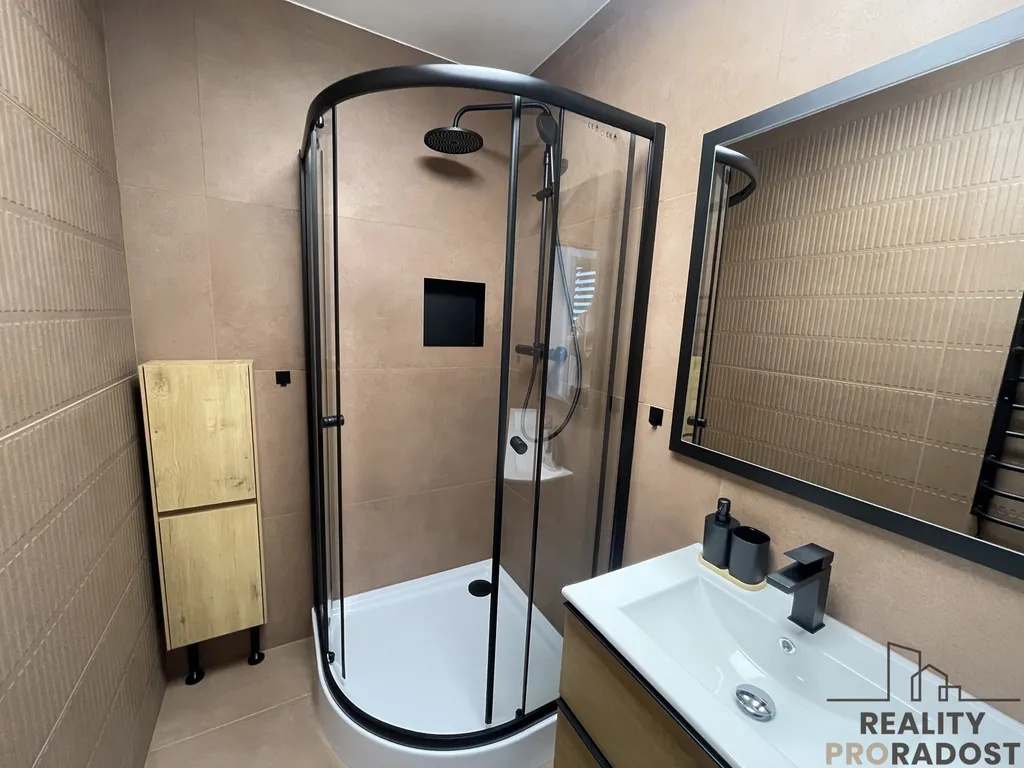 koupelna obsahuje nepoužitý sprchový kout, dvě umyvadla, nastavitelný radiátor a úložné prostory