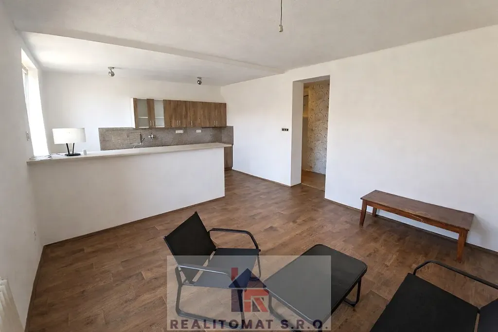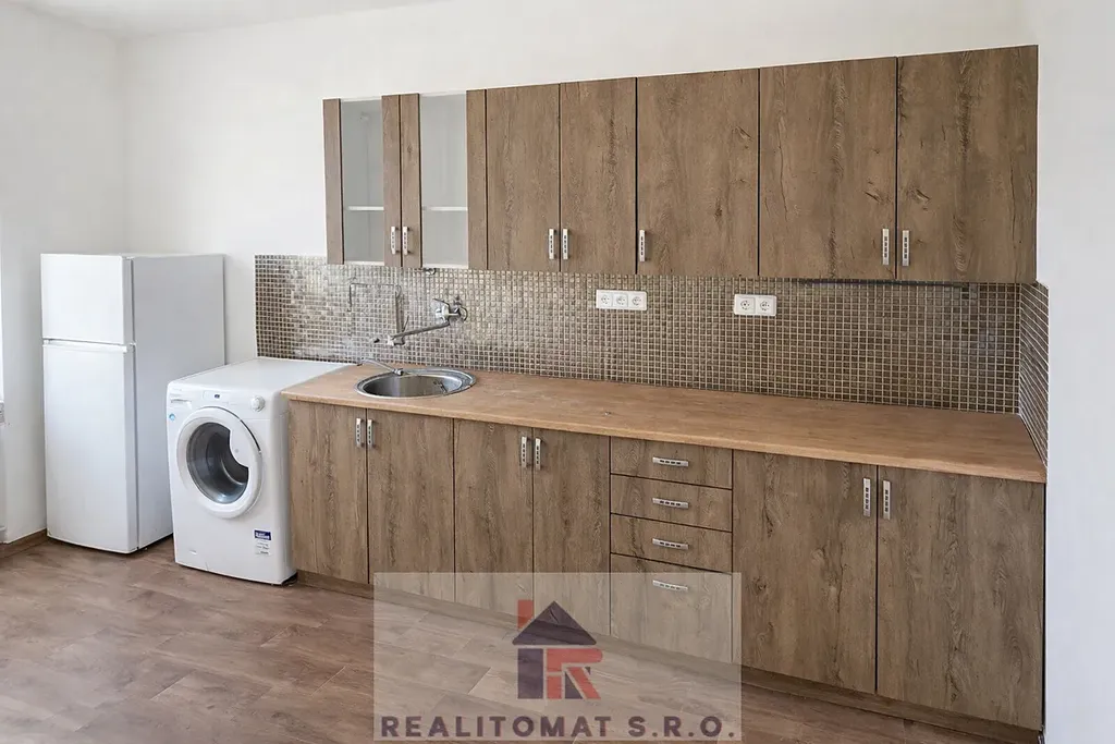 V bytě kuchyňská linka s barovým pultem, pračka, lednice. K dispozici židle, stolky, lampa a vestavěná skříň.