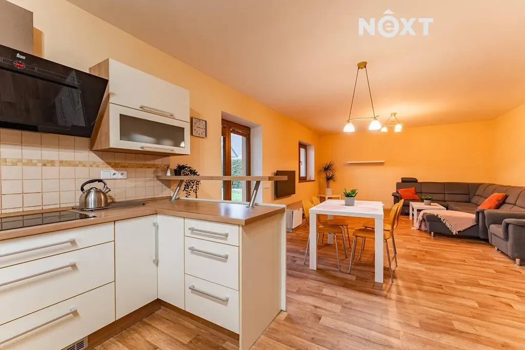 Dům je prakticky řešen jako 4+kk a nabízí dostatek prostoru jak pro rodinný život, tak pro pohodlné bydlení jednotlivců či párů. V přízemí vás přivítá vstupní část s chodbou, odkud se dostanete do koupelny se sprchovým koutem a toaletou. Dominantou celého domu je světlý obývací pokoj propojený s kuchyní, který tvoří přirozené centrum domácnosti. Z obývacího pokoje je přímý výstup na zahradu a zastřešenou terasu, ideální pro letní posezení, grilování nebo klidné chvíle s rodinou. Nechybí ani praktická komora pod schodištěm, využívaná jako špajz, a technická místnost, kde je umístěn kotel na tuhá paliva spolu s bojlerem na ohřev vody.