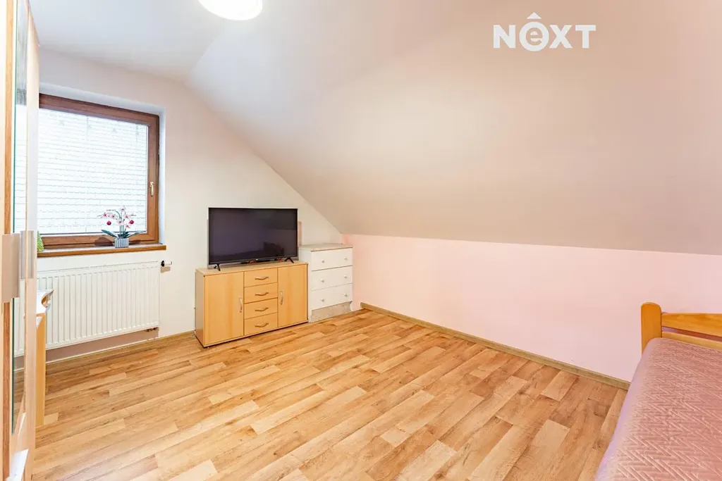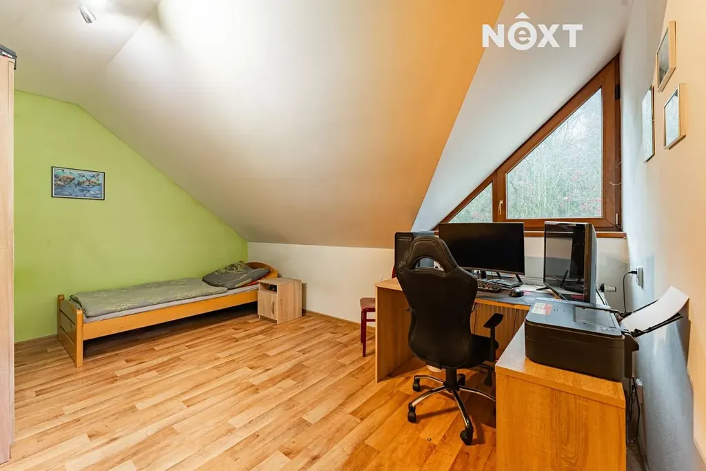 V patře se nachází tři samostatné obytné místnosti, které lze využít jako ložnici, dětské pokoje, pracovnu nebo pokoj pro hosty. Nechybí zde ani druhá koupelna s vanou a toaletou, což výrazně zvyšuje komfort každodenního bydlení.
