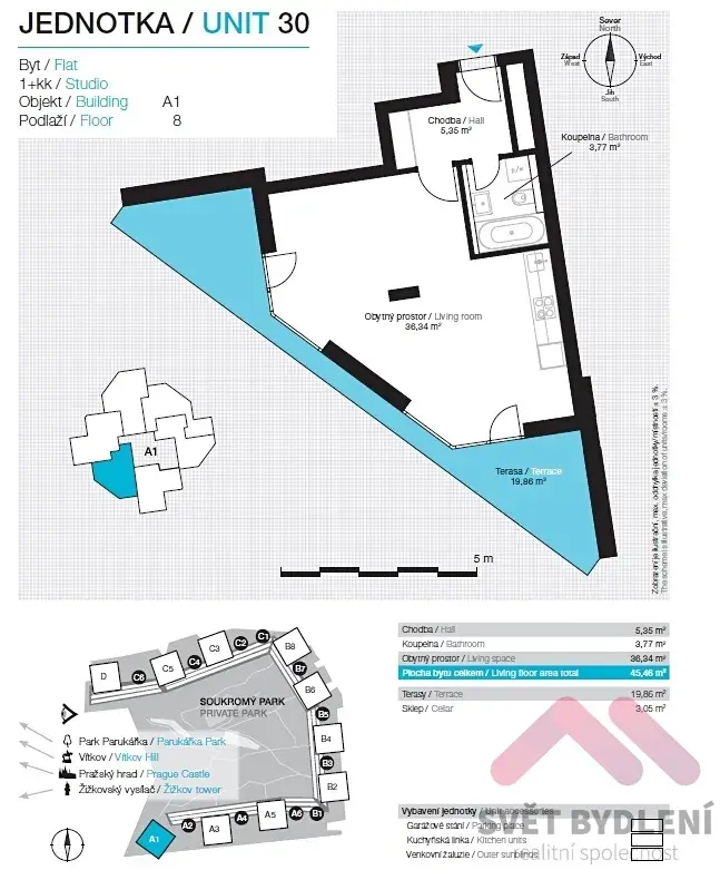 krásný byt 1+kk, 46m2 + 20m2 terasa, krásný výhled, parking, soukromý park, P-3 Žižkov ul. Pitterova.