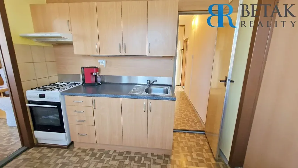 V bytě je kuchyňská linka se sporákem, omítky, PVC podlahy, plastová okna a měřiče vody i tepla.