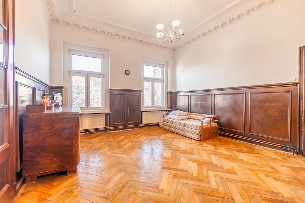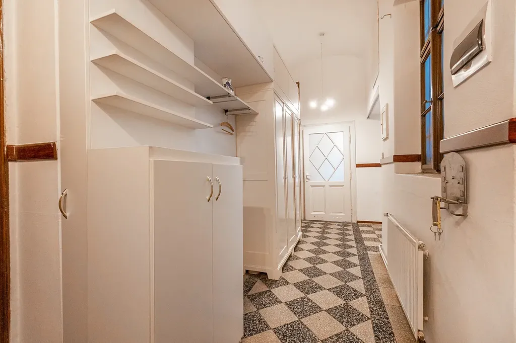 Byt je částečně vybaven prvorepublikovým nábytkem v obytných místnostech, krásnými kachlovými kamny (nejsou funkční). Podlahy renovované parkety a původní dlažba. Okna jsou již nová plastová včetně žaluzií a kuchyňská linka moderní včetně spotřebičů.