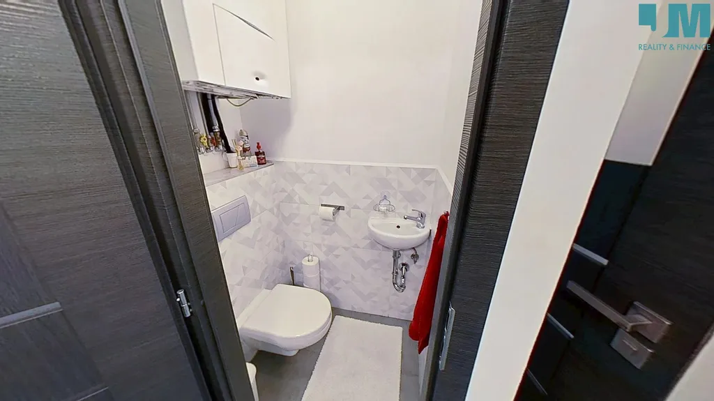 Koupelna je vybavena sprchovým koutem, umyvadlem se skříňkou a zrcadlem. Závěsná toaleta je samostatná a k dispozici je zde také další umyvadlo a plynový kotel.