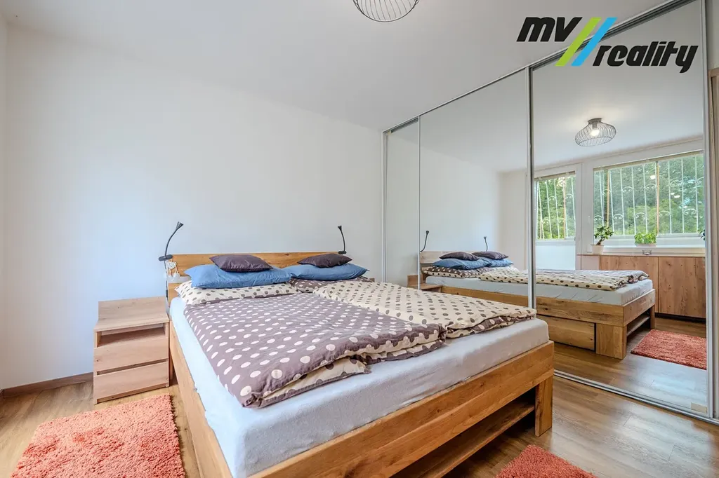 Za vstupními, bezpečnostními dveřmi je předsíň (7,3 m²) se šatnou (2,7 m²). Vpravo se nachází klidová část bytu ve které je pokoj - pracovna, nebo dětský pokoj (7,55 m²) a ložnice (11,73 m²) se vstupem do zasklené lodžie (6,3 m²) opatřené bezpečnostní mříží. Proti vchodovým dveřím je vstup do koupelny s vanou a umyvadlem (2,56 m²) a oddělené toalety (1,32 m²). Nalevo je obytná část bytu s prostorným obývacím pokojem a kuchyňským koutem (25,84 m²). V kuchyni je kompletně vybavená linka se všemi spotřebiči.