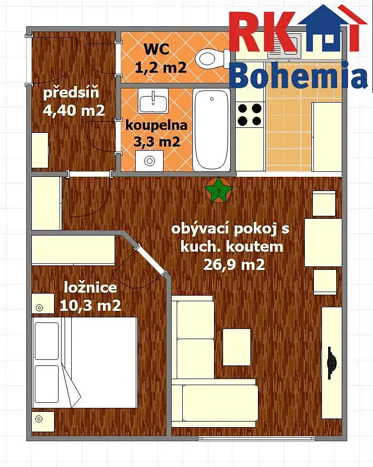 Byt se nachází ve 2. NP ze 3 v cihlovém domě bez výtahu a je v dispozici 2+kk s výměrou 46,10 m2.