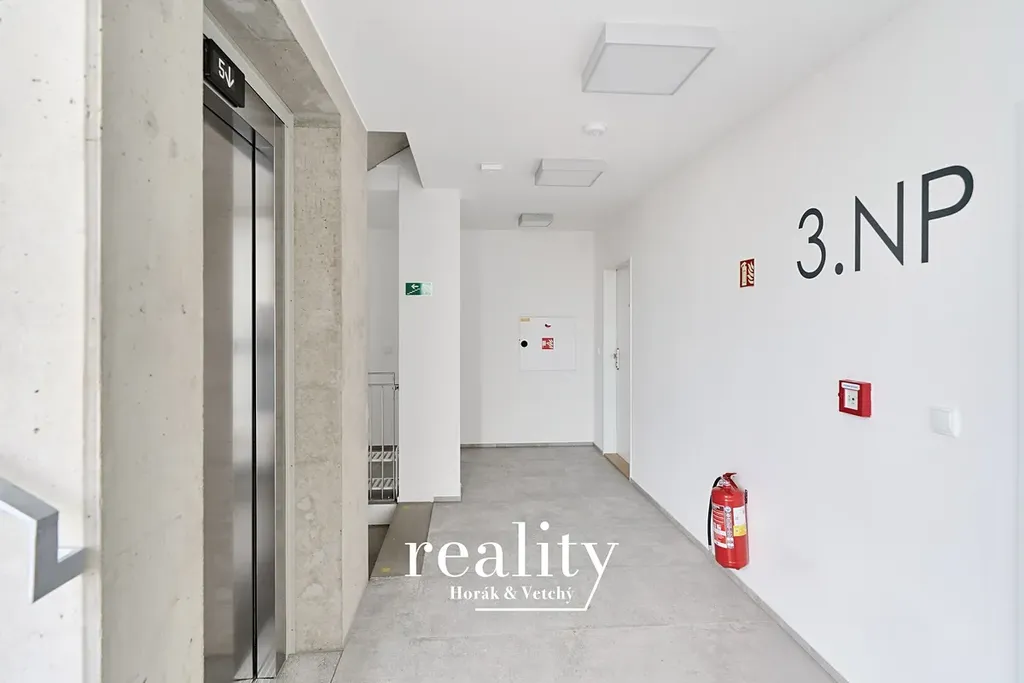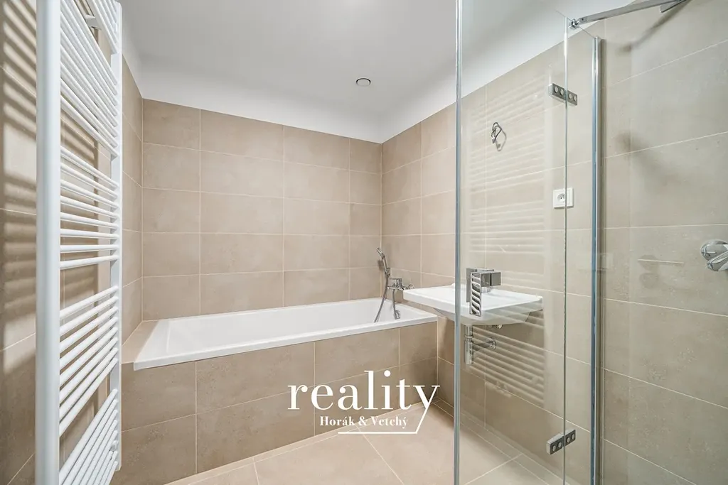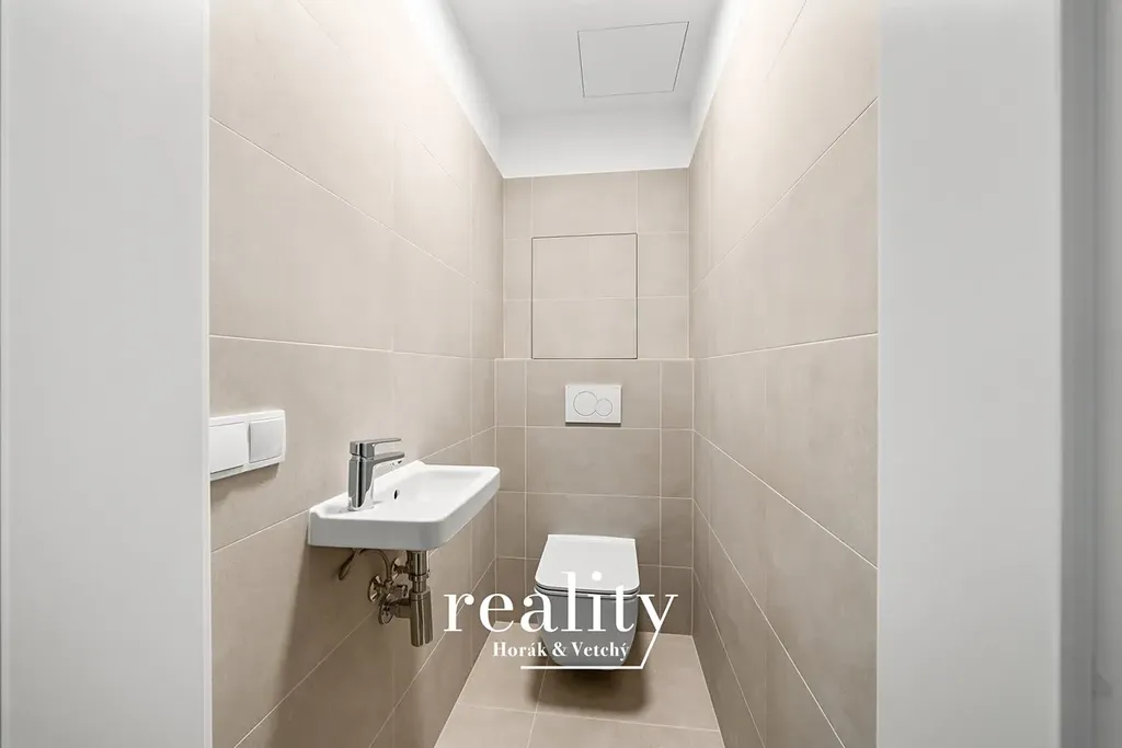 Vstupní část bytu je vybavena úložným prostorem, vyrobeným na zakázku, který lze vidět na fotkách. Z předsíně je vstup do samostatného WC a dále do koupelny, která je vybavena vanou i sprchovým koutem. Z chodby plynule přecházíme do prostoru pro kuchyň a obývací pokoj (31,9 m2).