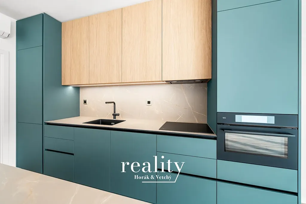 Kuchyně je vyrobena na zakázku s vestavnými spotřebiči zn. AEG (vestavěná lednice s mrazákem, varná deska, myčka, odsavač par, trouba). Kuchyňský ostrůvek slouží současně jako prostor pro stolování, dá se s ním i manipulovat.
