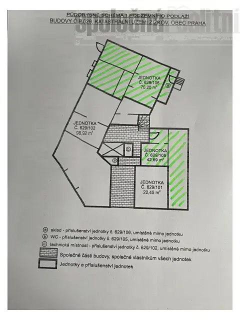 Nabízíme k prodeji podíl na sklepních 4 sklepních jednotkách ve výši id.22579/46852 (současný stav) o celkové výměře 234 m2. Předjednaná dosud nezrealizovaná výměna s druhým spoluvlastníkem za 100% podíl na 2 suterénních jednotkách o celkové výměře 113 m2 (70 m2 a 43 m2). Větší 70 m2 jednotka má vzhledem ke skutečnosti, že dům stojí ve svahu 2 okna a samostatný vstup z ulice. V domě pouze nové rozvody plynu. Dům v zanedbaném stavu, v plánu zatím rekonstrukce střechy. Žádaná lokalita, klidná ulice. Jednotka je vedena jako jiný nebytový prostor. V domě lze koupit ještě 3 bytové jednotky ve 2. patře domu a jednu nebytovou jednotku v přízemí. Při koupi podílu na suterénních jednotkách a všech 4 dalších jednotek jako celku je cena 115.000 Kč/m2 pro všechny jednotky (celková výměra 235 m2) a za podíl na sklepích. za 35.000 Kč/m2 (celkově také 234 m2), tj. celková investice 35.300.000,- Kč