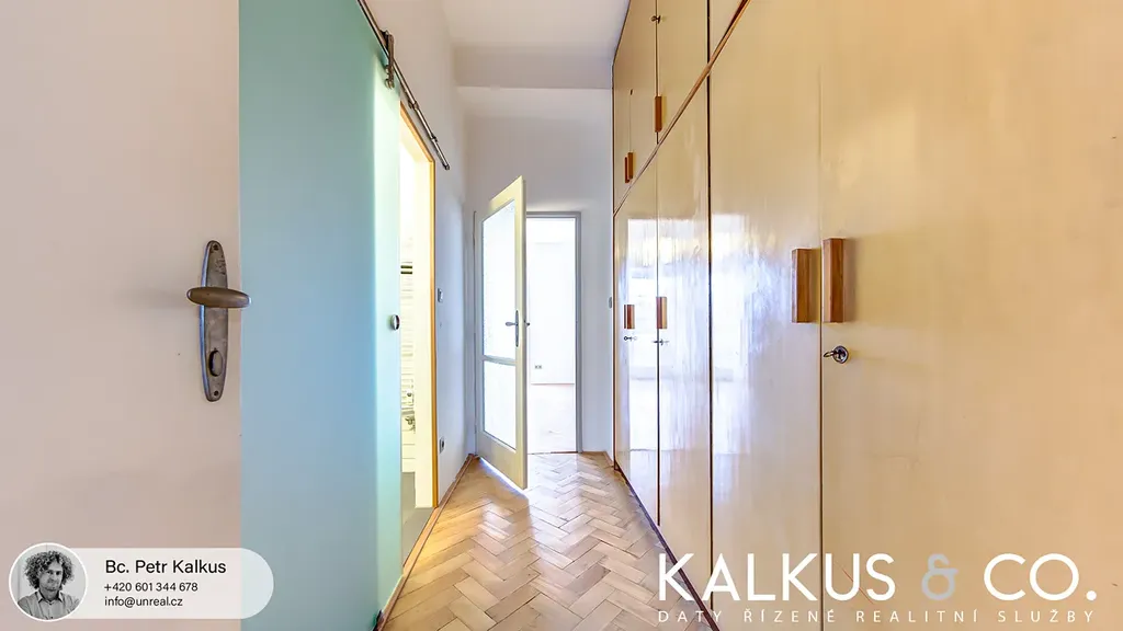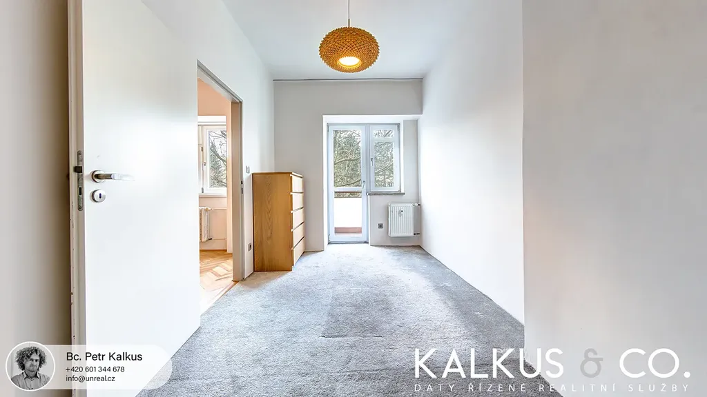 Čistý interiér modernizován v retro stylu si zachovává některé své původní interiérové prvky ze 40. let včetně příjemných bukových parket. Okna jsou dřevná euro. Dispozice sestává z prostorné předsíně, rozlehlého obývacího pokoje (cca 25 m2) s otevřenou kuchyní, dvou samostatných pokojů (jeden s francouzským oknem, druhý se vstupem na lodžii), koupelny s vanou a dvojumyvadlem, samostatného WC a komory. Kuchyně je vybavena indukční deskou, horkovzdušnou troubou, digestoří a myčkou nádobí. Vestavné skříně v chodbě, vestavný botník a skříň v předsíni, regály v komoře, praktický sušák na prádlo v koupelně, domovní videotelefon, internet - optika. Prostorný sklep k dispozici. Parkování je možné přímo u domu za 1 200 Kč / měs.