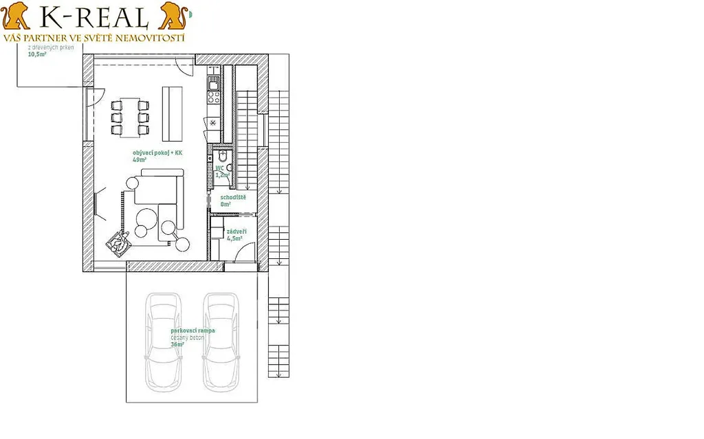 První podlaží je navrženo jako samostatná bytová jednotka 1+kk, kterou lze přizpůsobit vašim požadavkům. Součástí vybavení je podlahové topení s plynovým zdrojem, které zajišťuje komfortní teplo po celý rok. Elektroinstalace je připravena pro dobíjení elektromobilů a instalaci fotovoltaické elektrárny. Exteriér domu nabízí letní terasu ideální pro odpočinek, příruční sklad a dvě parkovací místa