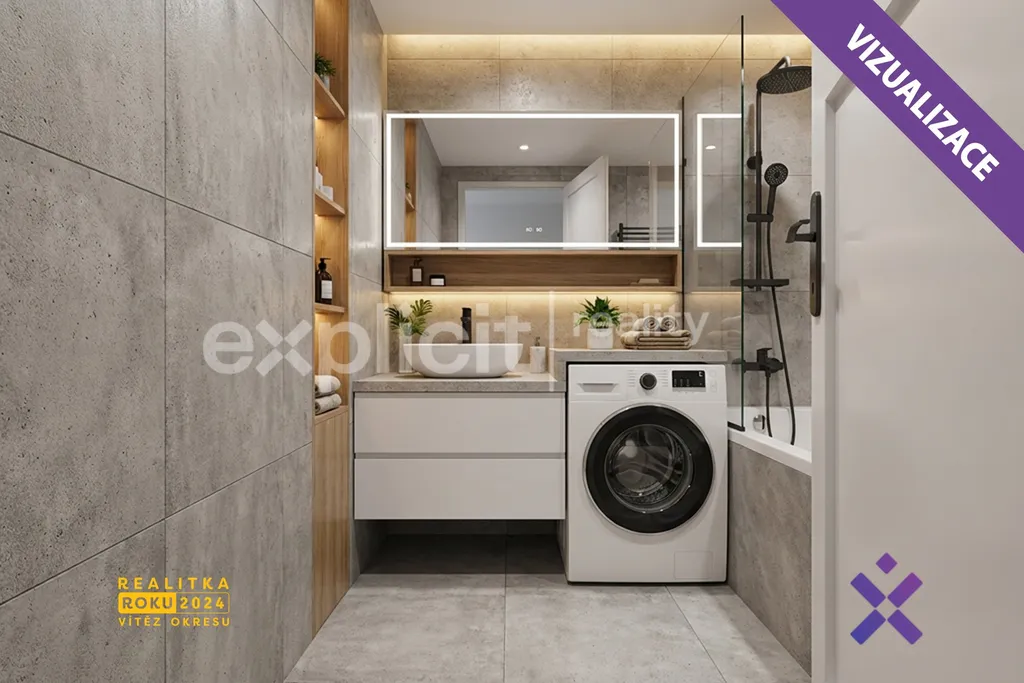 Koupelna s vanou je oddělena od samostatné toalety, což zvyšuje komfort bydlení. Velkou výhodou jsou dvě praktické špajzky, které poskytují dostatek úložného prostoru.
