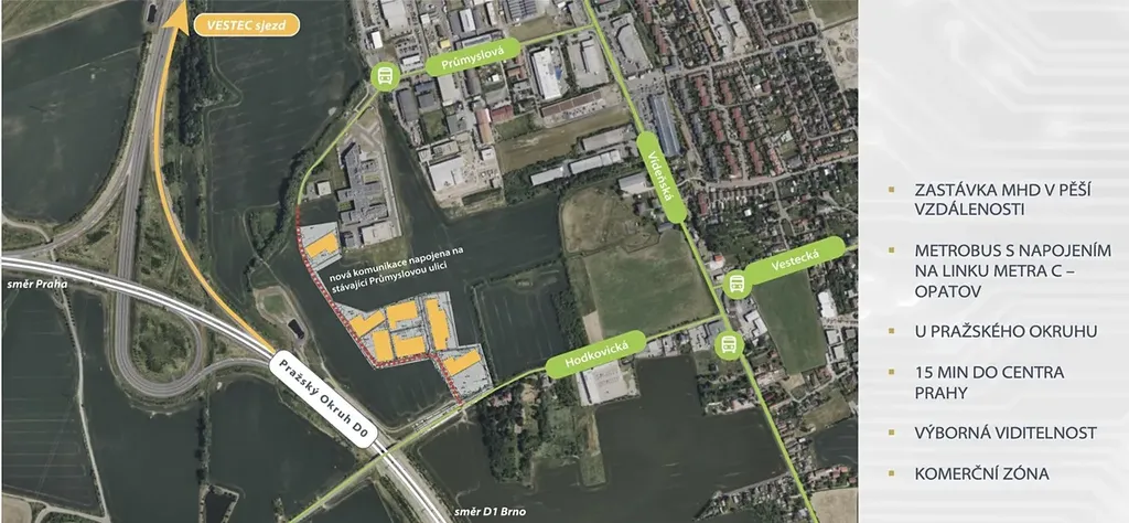 V exkluzivním zastoupení nabízíme k prodeji komerční pozemek s platným ÚR pro logistiku a skladování, výrobu, obchodní prostory popř.vědu a výzkum a obč.vybavenost v rozvíjející se lokalitě Praha-Vestec, v ulici Průmyslová/Hodkovická. Komerční pozemky jsou plně zasíťovány (voda, elektřina, plyn, kanalizace, veřejné osvětlení), je zde vybudována páteřní komunikace a jsou určeny pro výstavbu dle těchto podmínek: