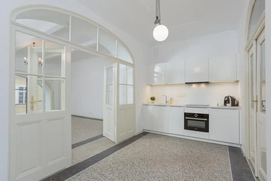 Prostory se nachází v 1.patře s výtahem. Celková plocha činí 76 m2 a sestává ze předsíně, haly s kuch. koutem, 2 místností (větší disponuje navíc zimní zahradou), koupelny a WC. Na podlaze je teraco.