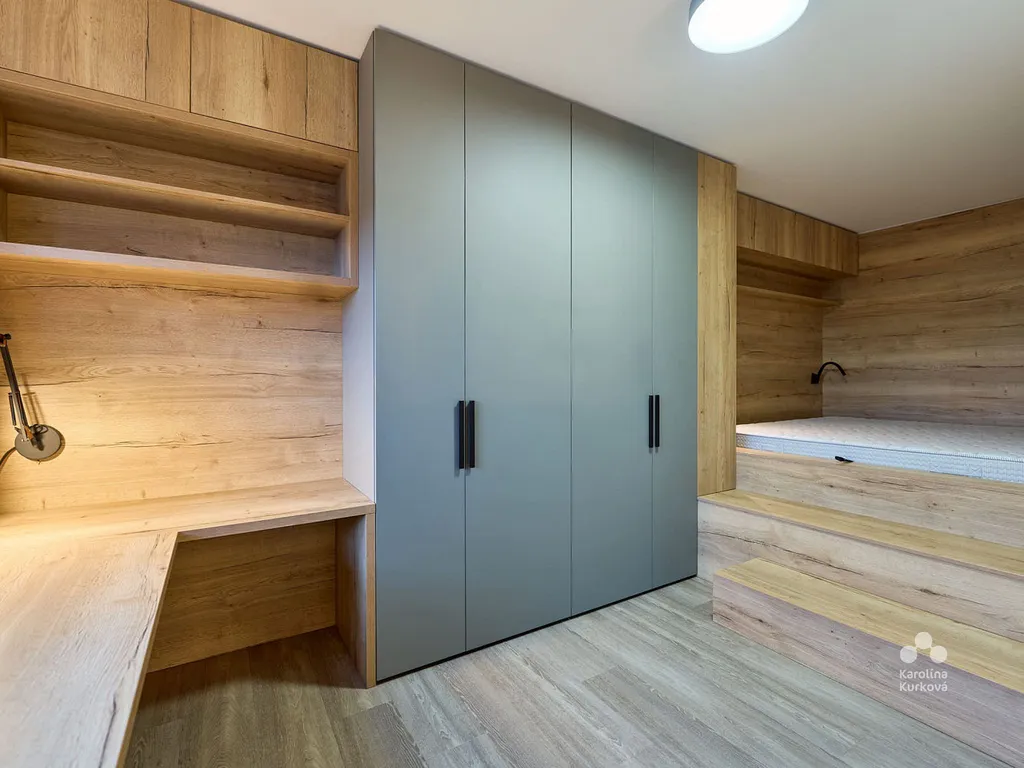 Byt sestává ze vstupní haly s vestavěnou skříní, obývacího pokoje s kuchyňským koutem se vstupem na balkón. Druhou částí pokoje je část pracovny a ložnice vybudované ve zvýšeném patře s mnoha uložnými prostory. Dále má byt koupelnu se sprchovým koutem a toaletou. A praktickou komoru.