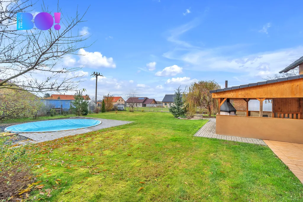 Na rodinný dům navazuje terasa pro grilování a odpočinek, zahrada o ploše 1125 m² s bazénem.