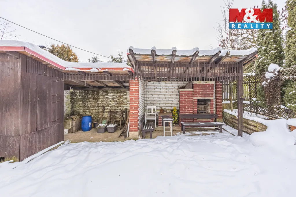 Pozemek o velikosti 1 073 m² nabízí dostatek soukromí, součástí je samostatná garáž, kůlny, úložné prostory a venkovní posezení s grilem.