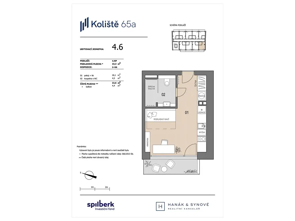 Atraktivní, prosvětlený byt 1+kk o velikosti 23 m2 s balkónem se nachází ve 4. nadzemním podlaží nového bytového domu s výtahem. Byt je orientován na západ.