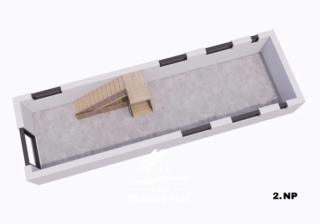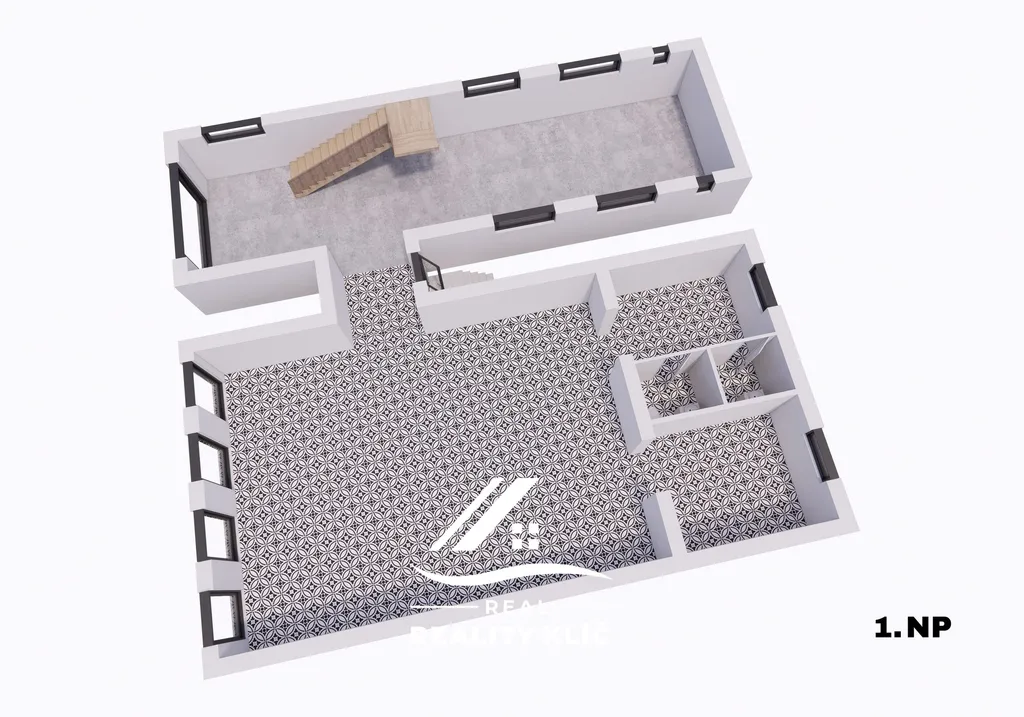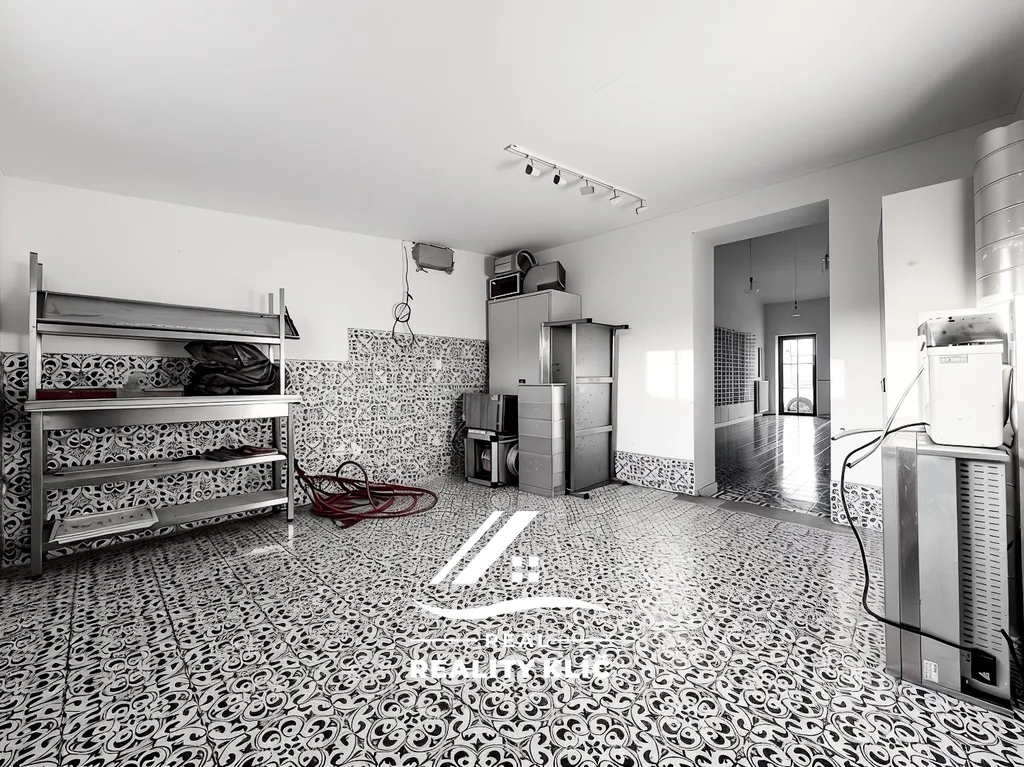 V přízemí původní části budovy se nachází hotový, reprezentativní prostor s vysokým stropem, odkrytými dřevěnými trámy a originálními výtvarnými detaily, které prostoru dodávají výrazný charakter. Velká okna, keramická dlažba a přímý vstup z ulice vytváří ideální prostředí pro restauraci, kavárnu, showroom, galerii nebo jinou komerční činnost. Součástí tohoto podlaží je i prostor vhodný jako kuchyňské či technické zázemí.