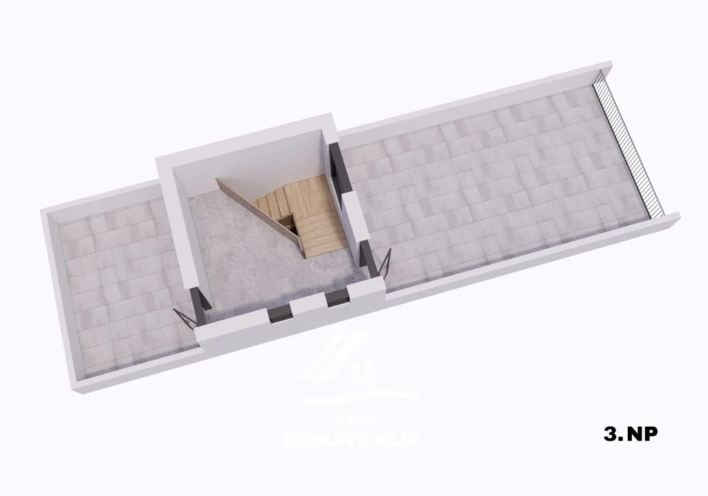 Třetí nadzemní podlaží přístavby nabízí vstup na prostornou střešní terasu s výhledem do okolní krajiny. Terasa dodává budově další využitelnou plochu vhodnou pro venkovní posezení, menší akce, relaxaci nebo doplnění zeleně.