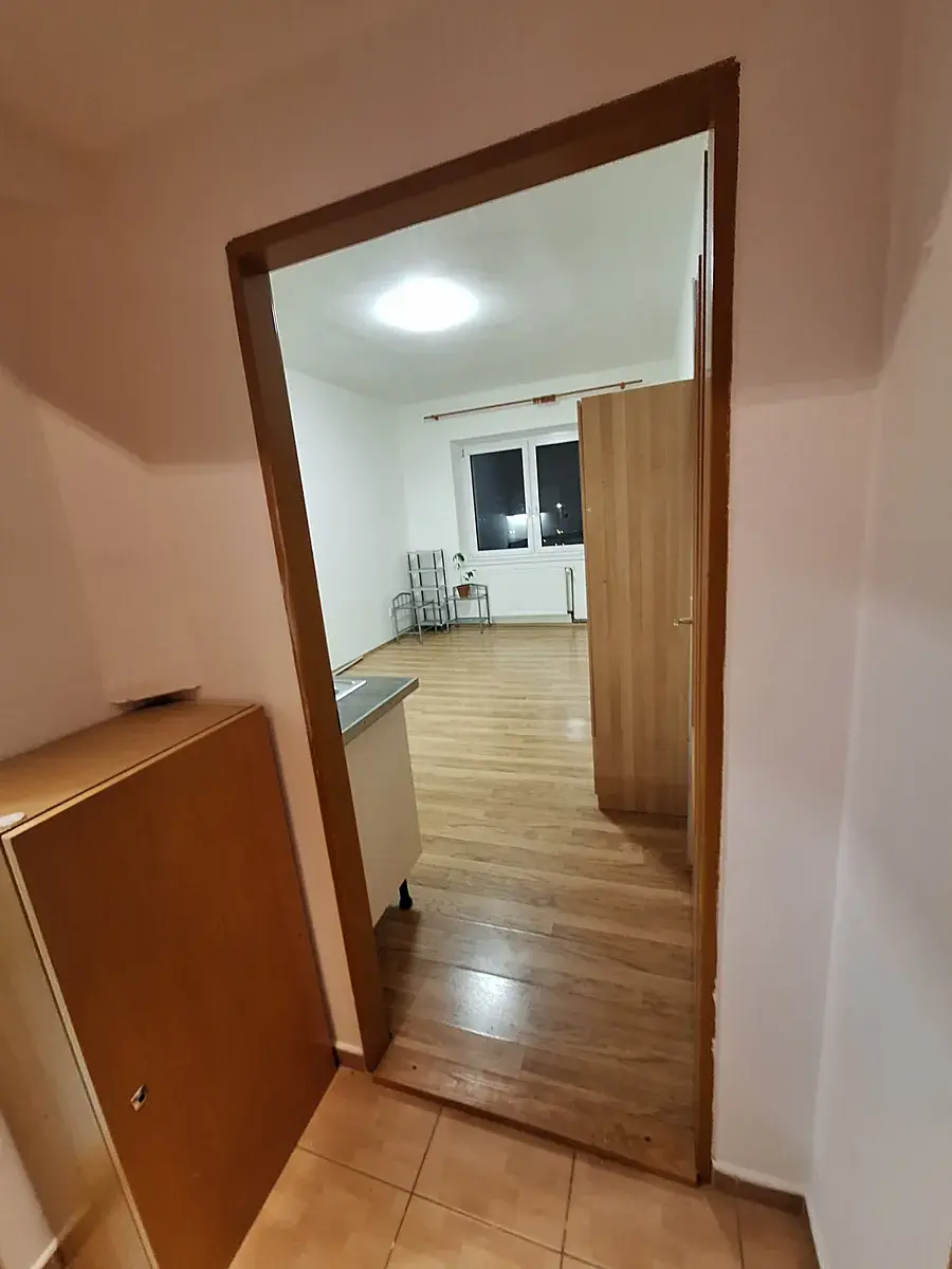 Pěkný byt 1kk, chodbička, koupelna s pračkou, sprchovým koutem a WC.