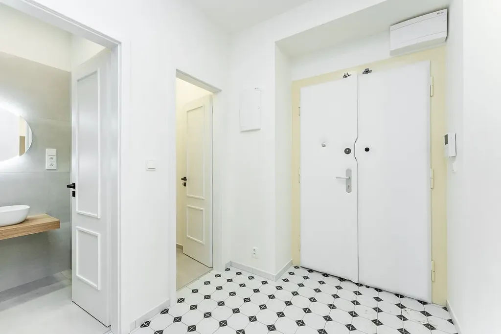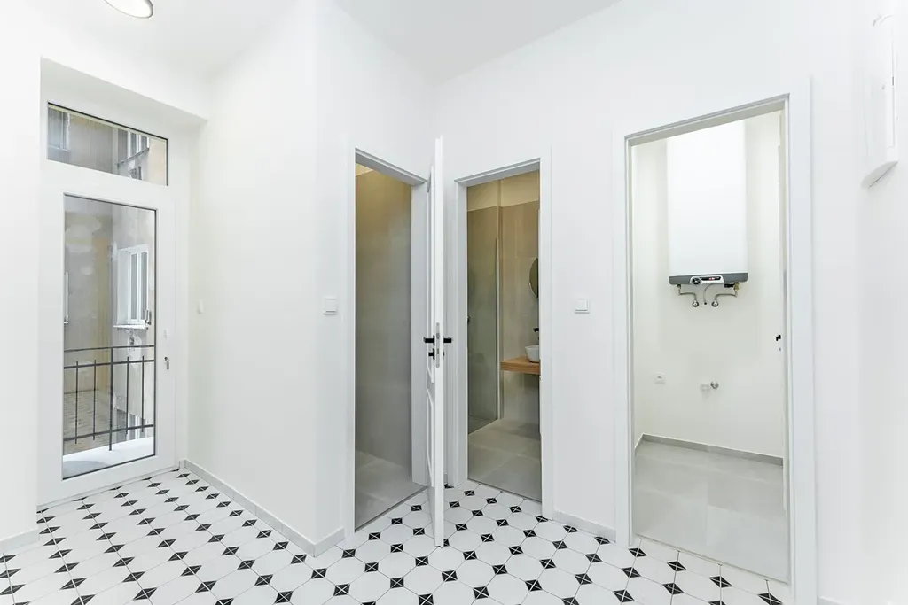 Byt sestává ze vstupní haly s dostatkem místa pro botník či šatní skříň. Dále technická místnost, ideální pro pračku a jako další úložný prostor. Samostatná koupelna se sprchovým koutem. Oddělená toaleta pro větší komfort.