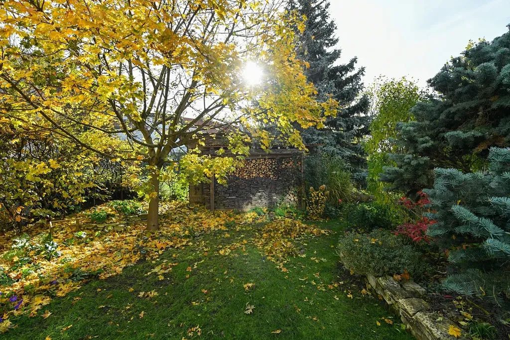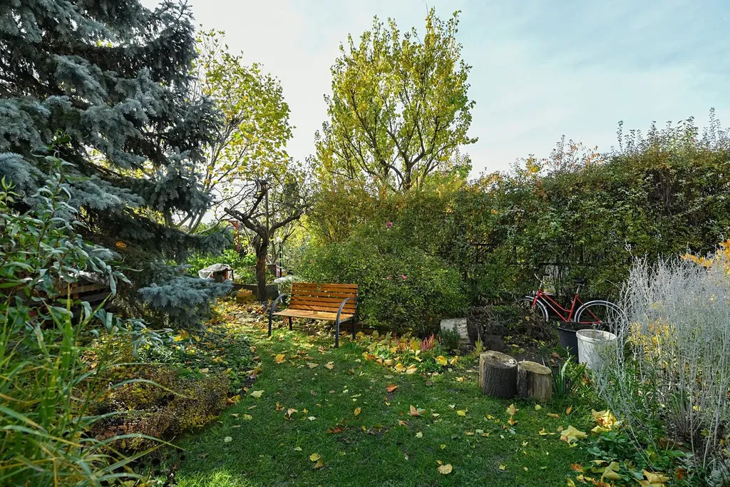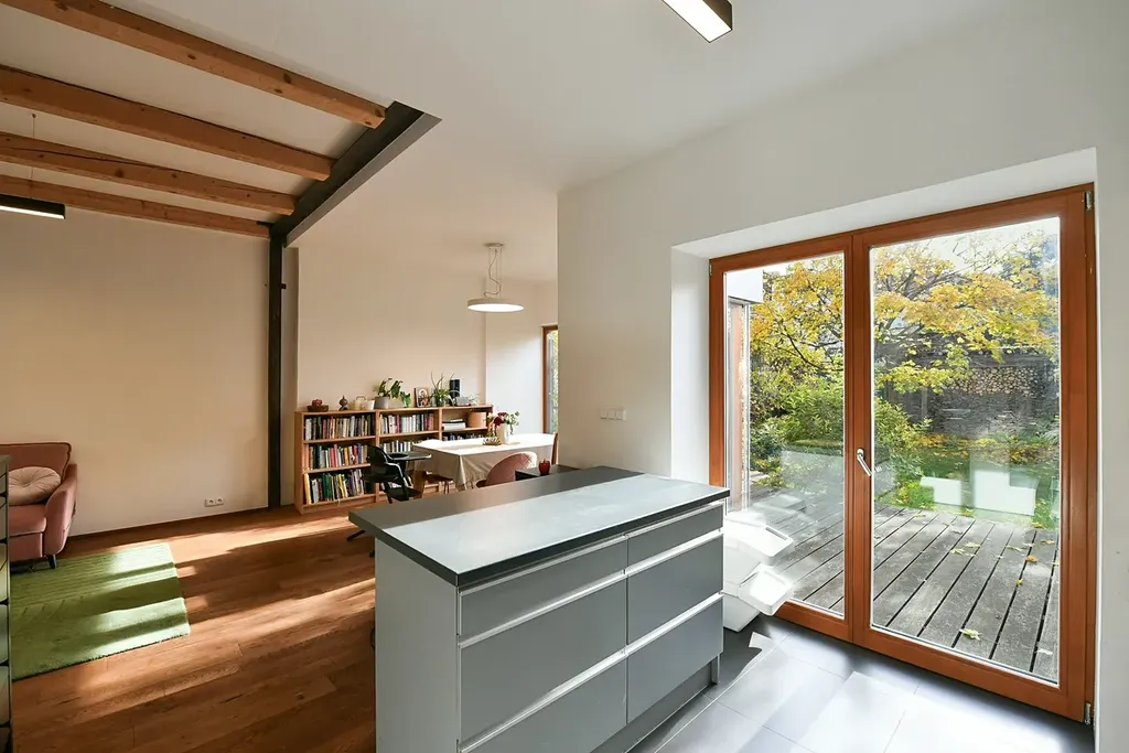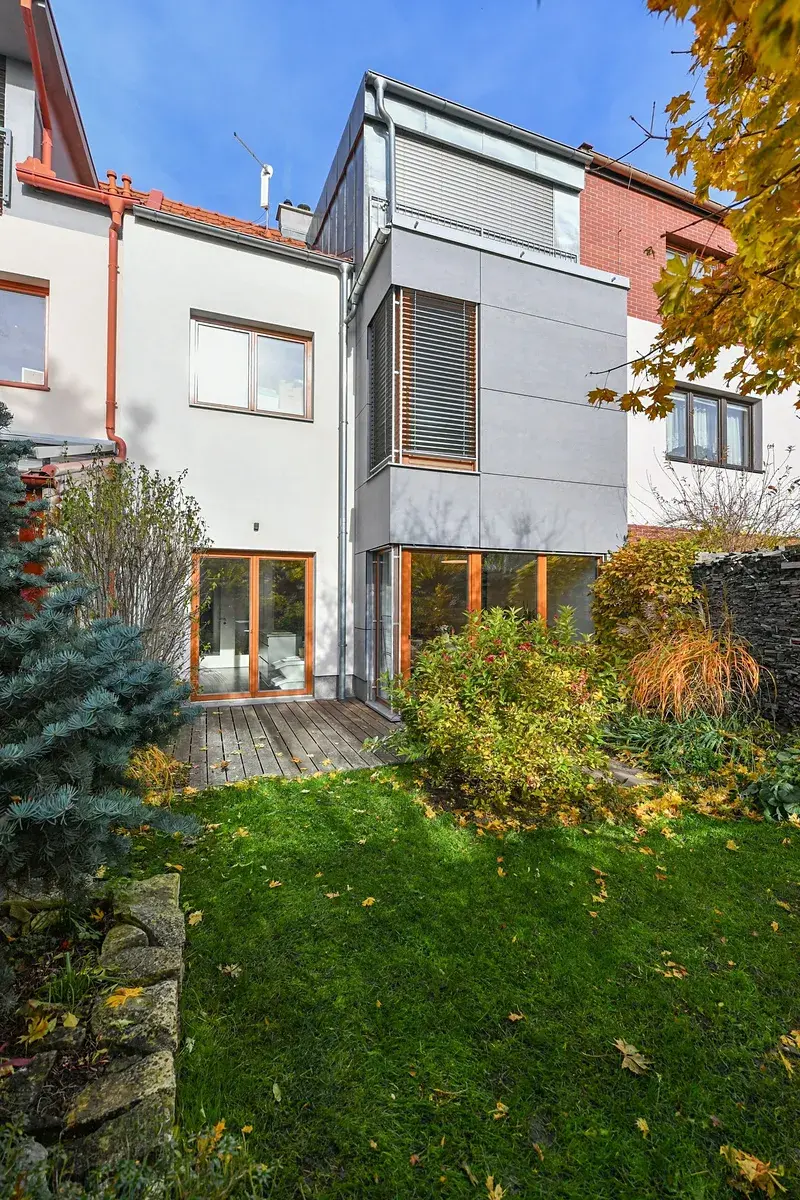 K domu náleží terasa a menší zahrada orientovaná do klidné části za domem, která poskytuje dostatek soukromí i přes centrální polohu domu. Parkování je možné v rámci modrých zón, jeden vůz je možné zaparkovat přímo před dům v rámci objektu.