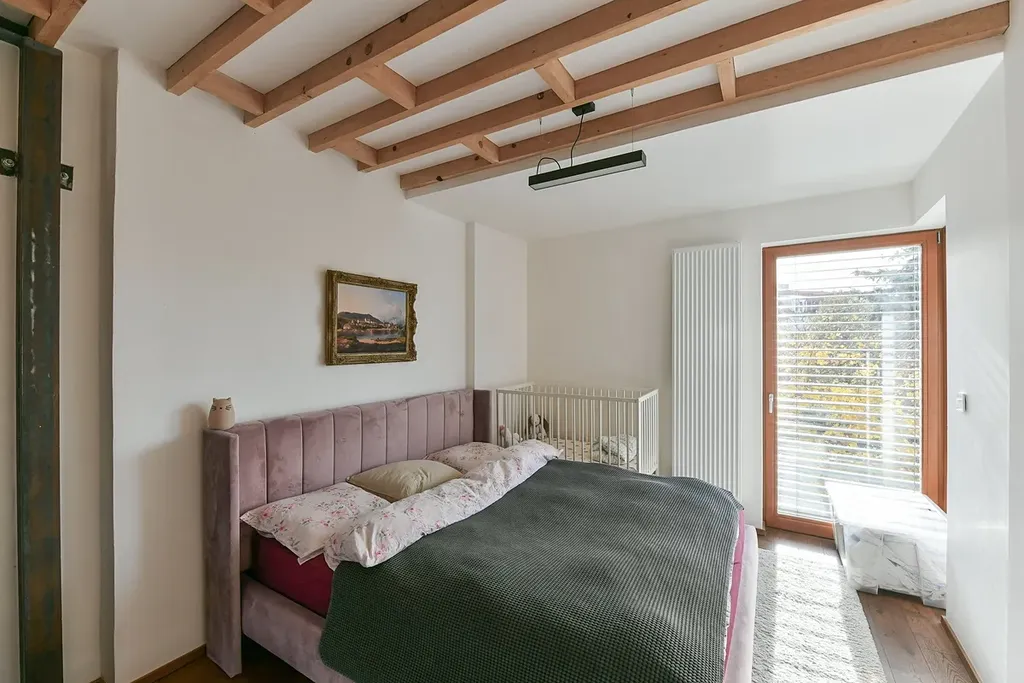 2. patro: prostorná ložnice s výhledem do klidného vnitrobloku, koupelna se sprchovým koutem a toaletou