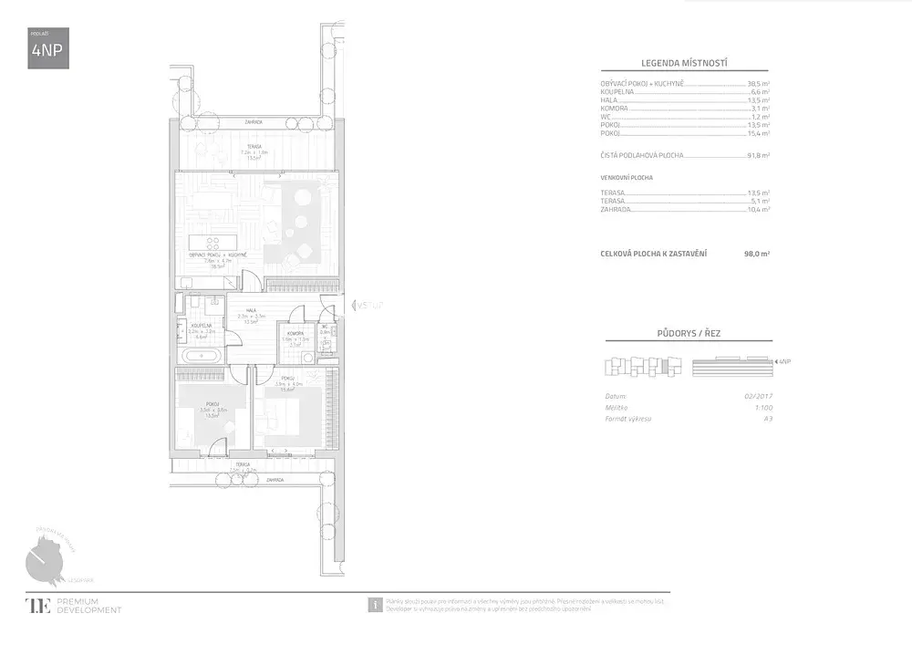 Tento designový, zařízený byt k pronájmu nabízí k užívání vstupní chodbu, prostorný obývací pokoj, plně vybavený kuchyňský kout, 2 ložnice, obě se vstupem na terasu, 1 koupelnu, samostatnou toaletu a komoru. K dispozici jsou 2 terasy (14 m2 a 5 m2) a 1 garážové parkovací stání.