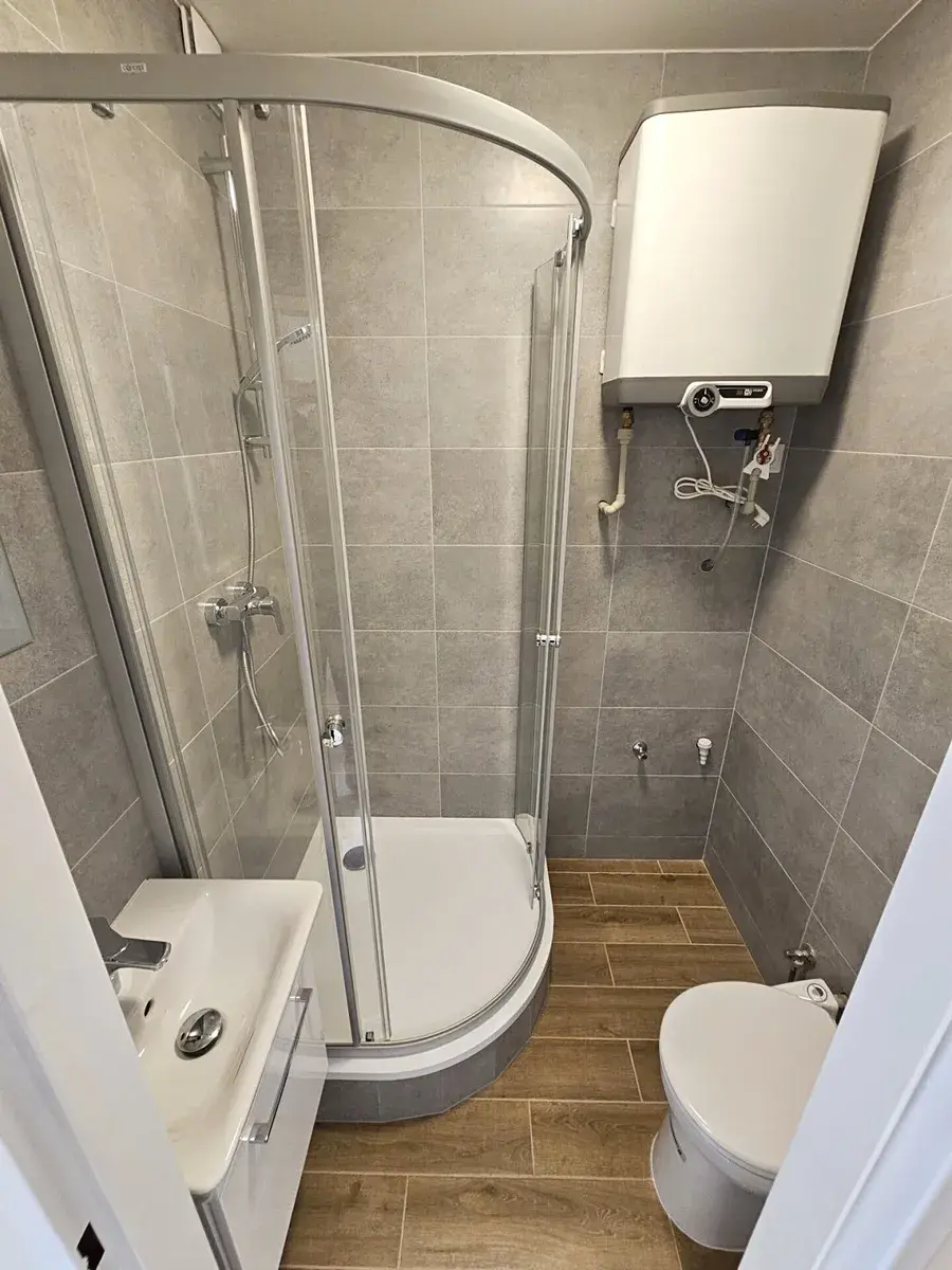 Je zde pokoj s kuchyňským koutem (linka, dřez, menší lednice, indukční vařič, mikrovlnná trouba) a koupelna se sprchovým koutem a s WC a s místem pro pračku s horním plněním.