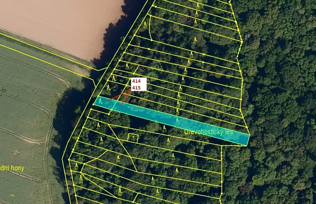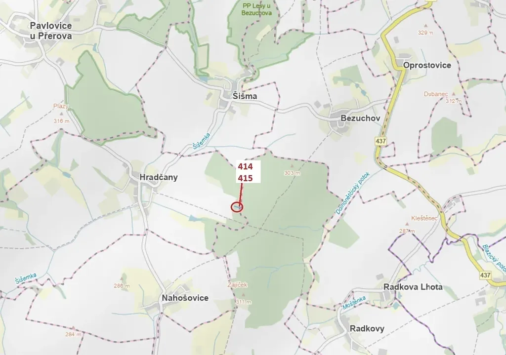 Lesní pozemek o výměře 975 m2, parcelní čísla 414, 415, podíl 1/1, katastrální území Hradčany na Moravě, obec Hradčany, obec s rozšířenou působností Přerov, okres Přerov, Olomoucký kraj. Po těžbě.
