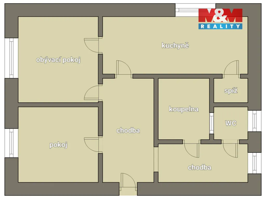 Dispozice bytu tvoří obývací pokoj s možností připojení krbových kamen, která dodají interiéru příjemnou atmosféru, samostatná ložnice, kuchyň se spíží, koupelna, oddělená toaleta a prostorná vstupní chodba. K bytu náleží dva sklepy, poskytující dostatek úložného prostoru.