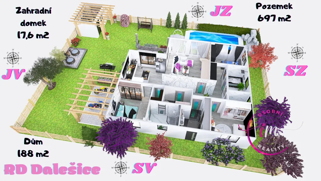 A pozemek? Tak akorát. Teda pokud na něm chcete třeba tenisový kurt, tak to ne, ale bazén a i něco navíc se v klidu vejde. A jak uvidíte na fotkách, parádní zahradní domek už tu taky je a to se počítá.