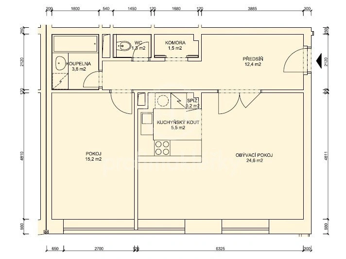 Dispozice: zádveří, chodba, samostatné WC, technická místnost, ložnice a kuchyň s prostorným obývacím pokojem.
