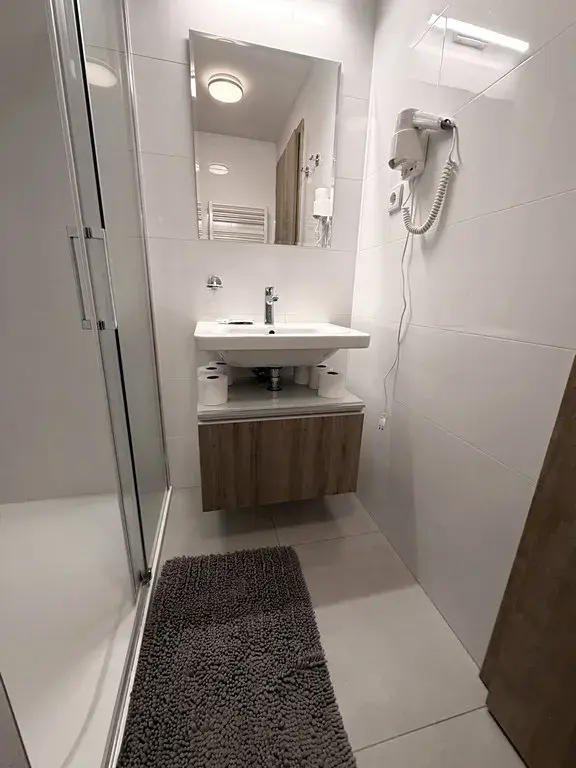 Vchodovými dveřmi vejdeme do vstupní chodby o výměře cca 4,3 m2, ve které se nachází po celé její délce vestavná skříň na míru se zabudovaným bojlerem pro ohřev teplé vody. Hlavní obytná část o výměře cca 21,8 m2 slouží jako kuchyně a obývací pokoj s ložnicí zároveň. Tato místnost je plně vybavena kuchyňskou linkou se čtyř plotýnkovou sklokeramickou deskou značky Elektrolux, digestoří, dřezem a lednicí s mrazákem. V pokoji je jídelní stůl se čtyřmi židlemi zajišťující komfortní stolování až čtyř osob. Nad stolem jsou dvě krásné designové lampy. V pokoji je dvojlůžko s nočními stolky a lampičkami, rozkládací gauč a nad gaučem se po žebříku dostaneme až do patrového jednolůžka. Naproti posteli je stěna s televizní skříňkou a televizí. Z obývacího pokoje je vstup na dominantu celého apartmánu, a to na terasu o výměře cca 21 m2, která slouží k relaxaci a odpočinku. Na terase je venkovní posezení, a to stůl se čtyřmi židlemi. Nesmíme opomenout dřevěný prvek na terase, který je posuvný a slouží k možnému zatemnění obytné místnosti. Nesmíme opomenout nádherný výhled do okolní přírody a na sousedící hory. Poslední místností v bytě je koupelna o výměře cca 3,5 m2, která disponuje velkým sprchovým koutem, WC, otopným žebříkem a umyvadlem se zrcadlem s umyvadlovou skříňkou. Koupelna je vybavena i vysoušečem vlasů.