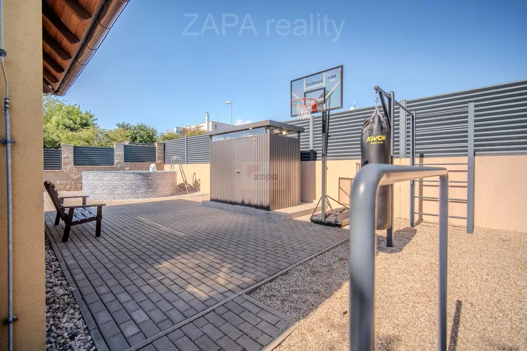 - Zahrada 494 m s vzrostlou zelení, závlahovým systémem a bazénem s protiproudem