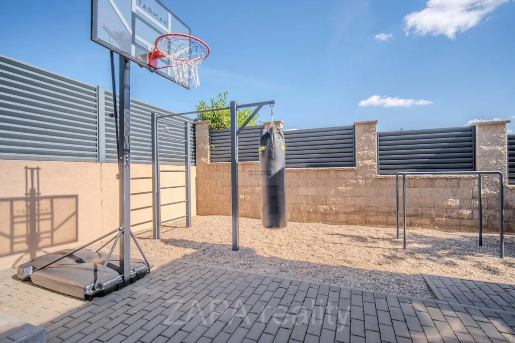 -Terasovitá zahrada s okrasnými i ovocnými dřevinami, workoutové hřiště, bazén s protiproudem