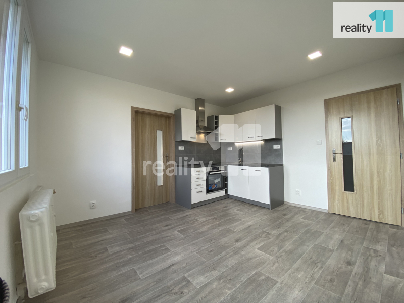 Dispozice a vybavení: vstupní chodba oddělena příčkou a dveřmi, kuchyň s obývacím pokojem, ložnice, zděná koupelna se sprchovým koutem, závěsná skřínka s umyvadlem, závěsné WC. Nová moderní kuchyňská linka do L vybavena vestavěným spotřebiči - vestavná trouba, komínový odsavač par, sklokeramická deska a myčka na nádobí. Příjemné prostředí v bytě vytvářejí snížené stropy s bodovými světly v kuchyni, koupelně a na chodbě.