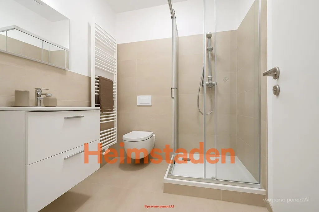 Ponořte se do relaxace v elegantní koupelně, kde najdete vanu, praktické umyvadlo, zrcadlo s osvětlením a moderní koupelnovou skříňku. Koupelna, vybavená topným žebříkem a automatickou pračkou, je dokonale propojená s toaletou, čímž se vyznačuje svou efektivitou a moderností.