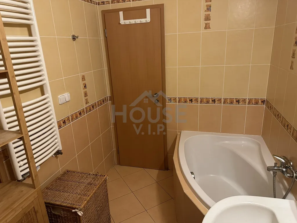 Byt je orientován na východ a nabízí světlý a příjemný interiér. Kuchyňská linka na míru od značky Koryna je vybavena vestavnými spotřebiči Electrolux. Koupelna disponuje keramickými obklady až ke stropu s dekorativními listelami, rohovou akrylátovou vanou Lyra s rovným dnem vhodnou i ke sprchování, závěsným WC a topným žebříkem doplněným elektrickou patronou pro provoz mimo topnou sezónu. V koupelně i vstupní chodbě jsou sádrokartonové podhledy s bodovým osvětlením.