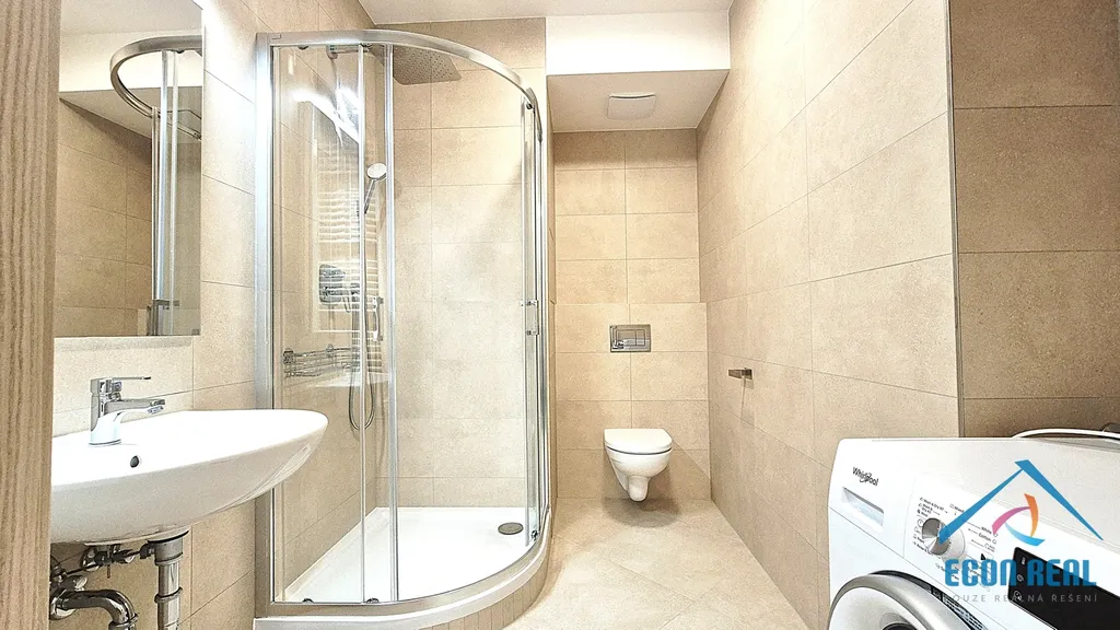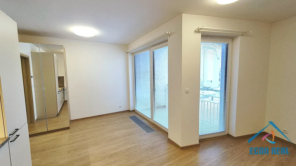 Společnost ECON REAL s.r.o. si Vám dovoluje nabídnout pronájem v podstatě nového bytu 1+kk, výměry 32 m2 (28,7 m2 byt + 4,1 m2 lodžie + 2 m2 zděná sklepní kóje a parkovací místo v garážích pod domem). Byt se nachází ve 4. patře bytového domu, je bezbariérový a orientovaný na JV a je vybaven dvěma kvalitními a velmi prakticky řešenými šatními skříněmi a kuchyňskou linkou s varnou sklokeramickou deskou, troubou, myčkou a vestavěnou lednicí s mrazákem. Příjemná koupelna disponuje propojením moderního sprchového koutu, s toaletou a umyvadlem se zrcadlem. Pračka s integrovanou sušičkou je součást vybavení. Celý interiér je moderní a světlý, vstupní dveře jsou bezpečnostní.