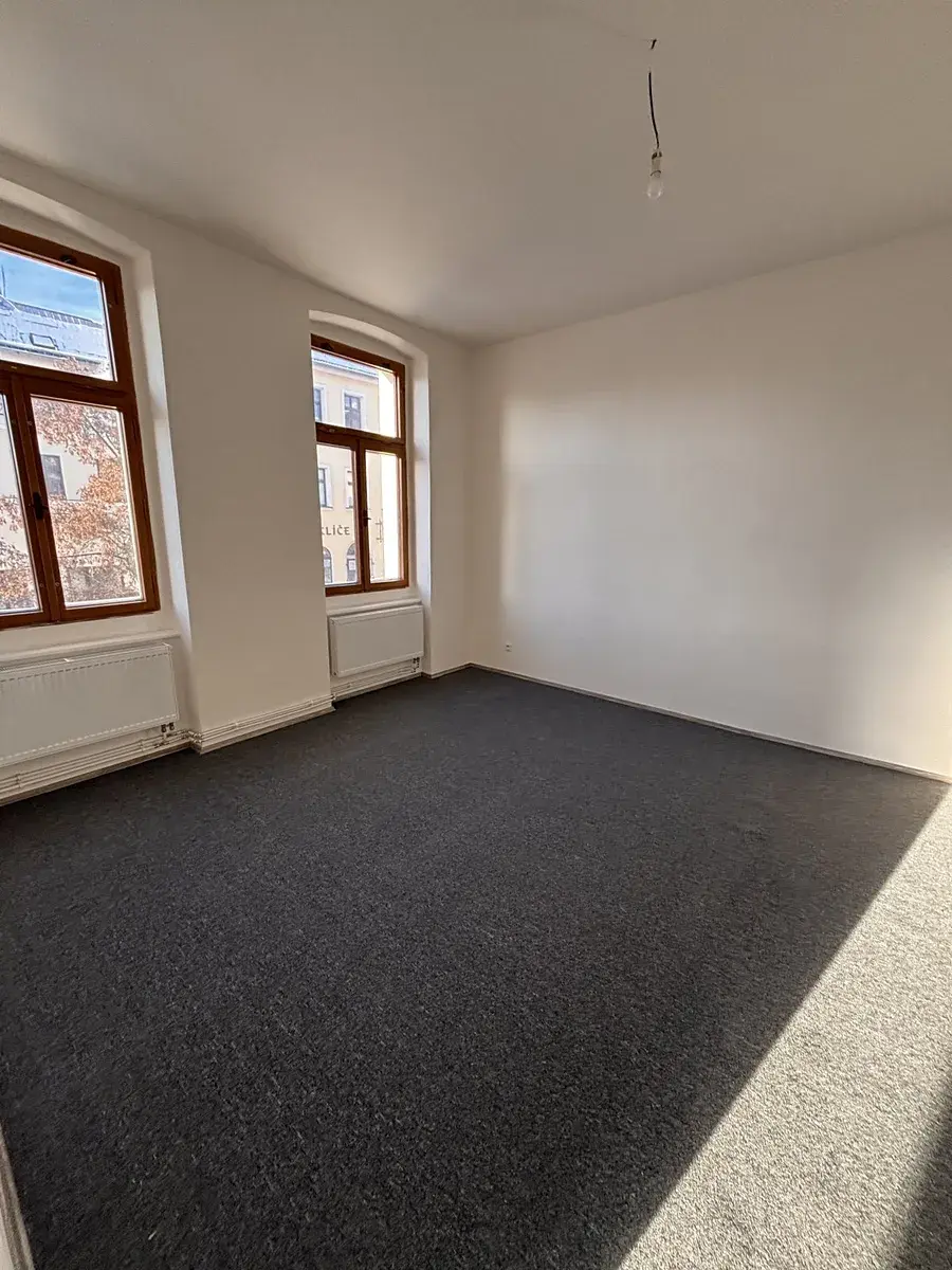 Pronájem bytu 3+1 ve 2. patře v cihlovém domě v centru Liberce. Dům je po rekonstrukci fasády. Byt nyní prošel kompletní rekonstrukcí a nyní je připraven na pronájem. Výměra bytu je 80m2, po vstupu ze společné chodby je menší předsíňka, kde jsou dveře na WC, kde je umyvadlo a je zde i okno. Pokračuje se do další předsíně a z ní jsou vstupy do kuchyně a 2 pokojů. Třetí pokoj je za obývacím pokojem. Okna jsou dřevěná, nová elektřina, nový plynový kotel. Kotel slouží na topení i ohřev vody. Kuchyň je bez kuchyňské linky, ale po dohodě s nájemníky bude nainstalována. V pokojích jsou nové podlahy – koberce, v předsíni a kuchyni je nové lino. Byt má nové štuky a bílou výmalbu. V domě není výtah. K bytu je možnost užívání společné zahrady za domem. Okna bytu jsou od východu až na západ. Byt je velmi slunný a světlý. Z oken kuchyně je výhled na město a zahradu za domem. Menší pokoj má okna do zahrady s výhledem na Ještěd, obývací pokoj výhled na Ještěd a ulici. Pokoj vedle obýváku jde do ulice a je orientován na západní stranu.
