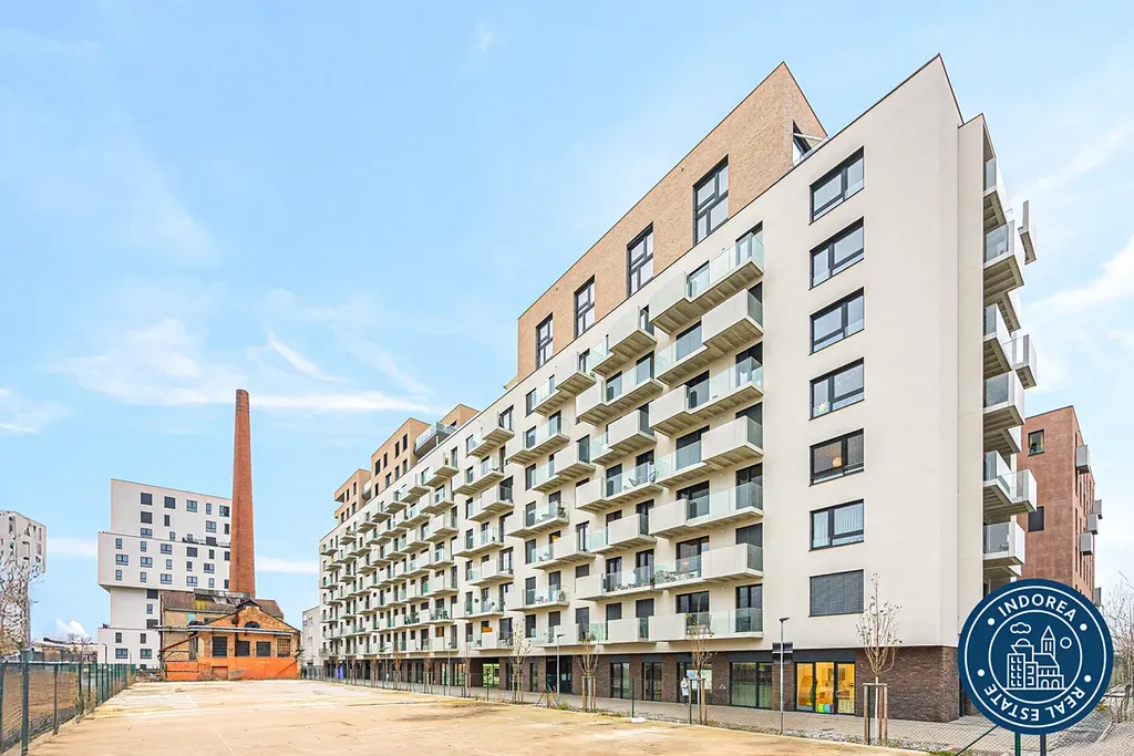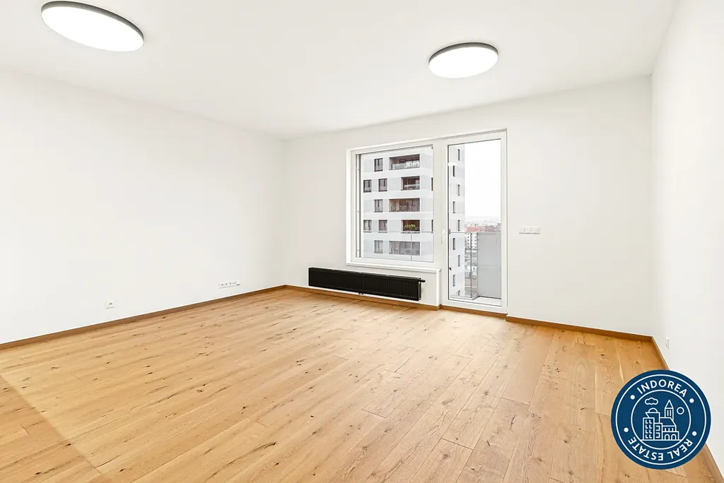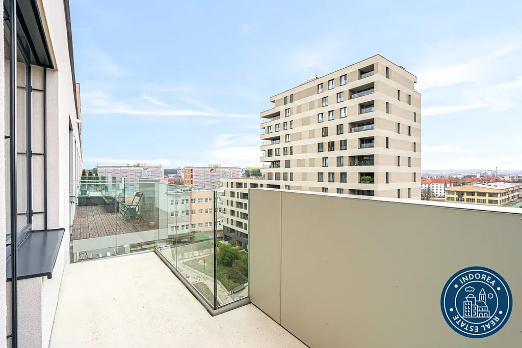 Byt je situován v předposledním osmém patře novostavby z roku 2025. Čtvrť Emila Kolbena od společnosti Skanska kombinuje komfortní bydlení s inspirativním prostředím.