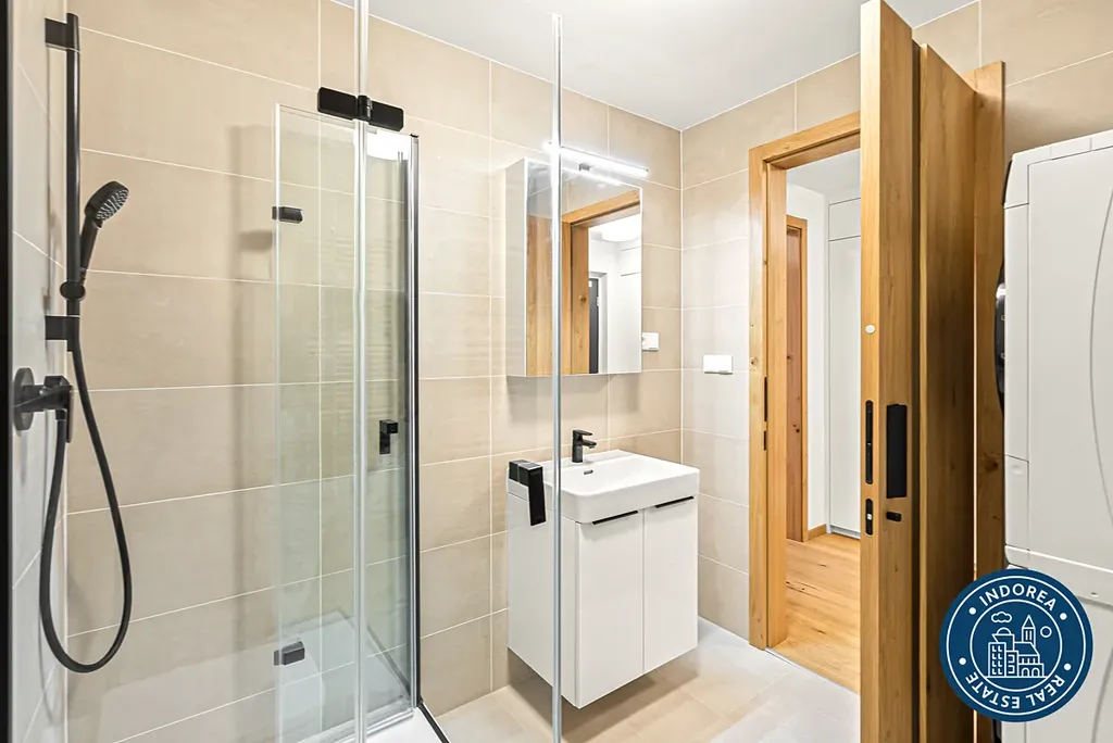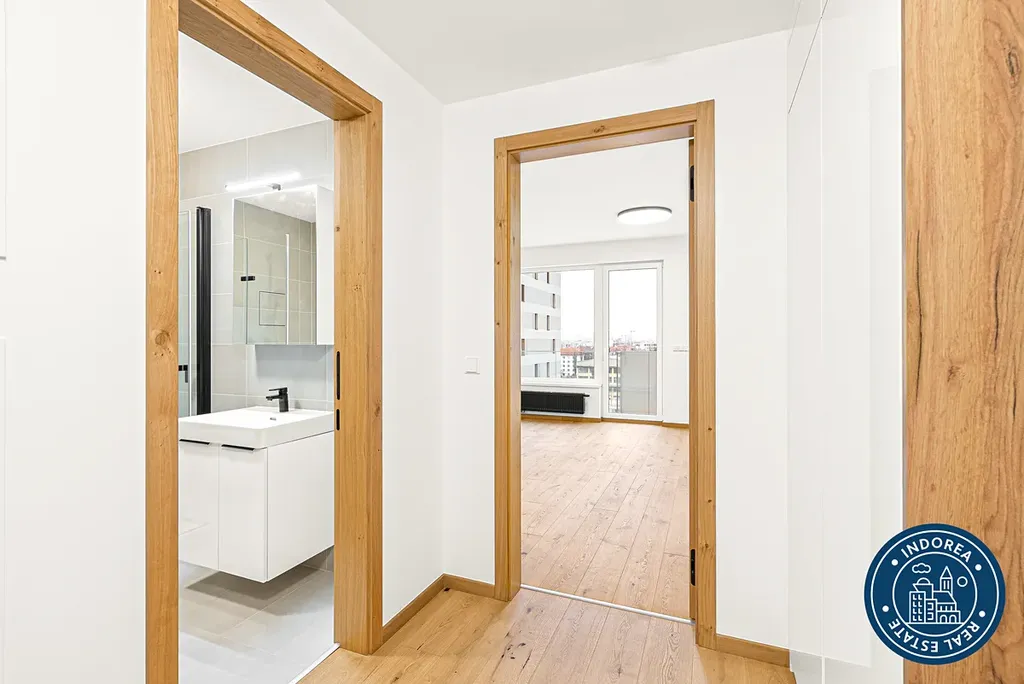 Další nespornou výhodou tohoto bytu je systém rekuperace, předokenní žaluzie a chytrý domovní systém Akuvox. Dále pak kvalitní lepená dřevěná podlaha, interiérové dveře vyšší kategorie stejně jako černé koncové prvky v koupelně.