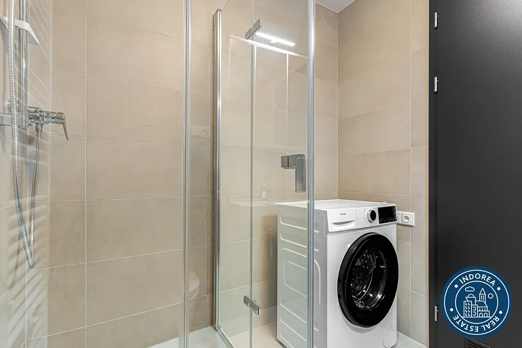 Tento zcela nový a zatím nikým neobývaný byt je částečně zařízen. Konkrétně tedy kuchyňská linka s vestavnými spotřebiči (myčka nádobí, trouba, varná deska, lednice), šatní skříň, koupelnový nábytek a automatická pračka.