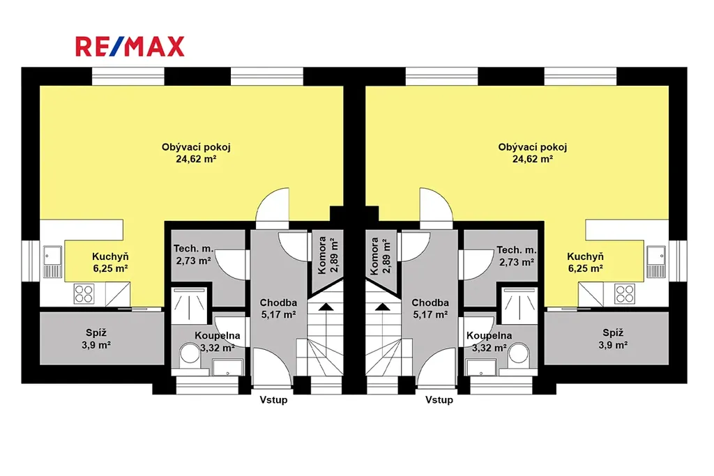 V přízemí se nachází prostorný obývací pokoj propojený s kuchyní a jídelnou se vstupem na terasu, spíž, koupelna se sprchovým koutem a WC, technická místnost a vstupní hala.