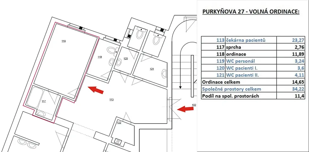 Nabízíme pronájem ordinace o velikosti 14,65 m2 s čekárnou a zázemím pro další dvě ordinace. Velikost společných prostor je 34,22 m2, podíl na společných prostorách je 11,4 m2. Platba nájemného čtvrtletně. K dispozici sprchový kout s umyvadlem, umyvadlo též v ordinaci. Položena dlažba a PVC. Vytápění dálkové. V případě zájmu o prohlídku kontaktujte paní Hrdličkovou, tel.: 603 738 058.